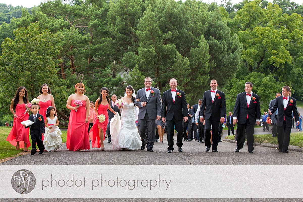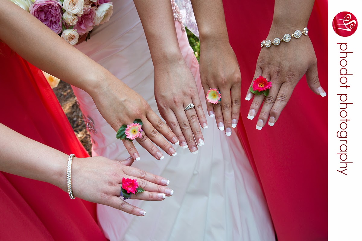 Austin and Kathy choose to gift engraved flasks to both their bridesmaids and groomsmen. Girls in pink, guys in black.